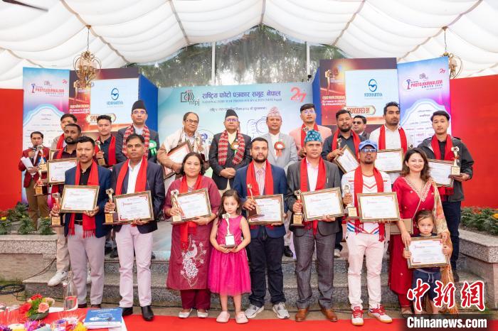 当地时间4月26日,第五届尼泊尔全国新闻摄影奖颁奖仪式在加德满都谷地城市勒利德布尔举行。图为获奖者及代表与嘉宾合影。主办方供图