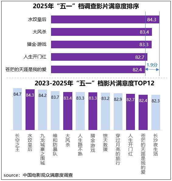 中国电影观众满意度调查・2025年“五一”档调查结果显示,“五一”档电影观众满意度得分83.6分,同比增长0.4分,为近年来同期调查的春季及“五一”档期满意度第一位。2025年“五一”档电影市场延续多元化内容供给,满意度主调查的五部影片类型题材各异,且都以较为优质的创作获得了观众“满意”评价,并首次实现在“五一”档主调查的影片全员突破82分,其中《水饺皇后》以84.3分夺得档期冠军,《大风杀》、《猎金・游戏》分别以83.4分、83.3分居第二、第三位。