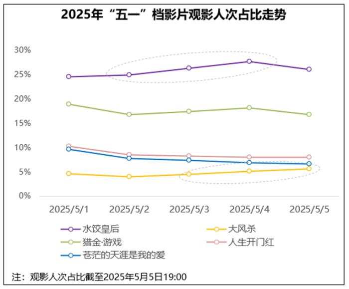 “五一”假期为传统的大众出游旺季,影院观影相对分流,但2025年“五一”档部分高满意度影片以优质创作激发了观影群众的分享传播热情,在行业内外都引发了较高关注度和讨论热度,其中《水饺皇后》《大风杀》两部影片传播度表现较为亮眼,都超过了85分,如#电影水饺皇后#、#半个娱乐圈都在大风杀#等话题在社交媒体掀起热议。同时,在高满意度支撑下,《水饺皇后》日票房始终保持领先,观影人次占比在5月2-4日稳步提升;《大风杀》5月3-4日票房连续逆跌,截至5月5日19:00观影人次占比已实现连续三日走高。