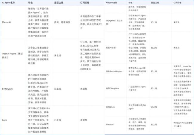 笔者下达的具体任务是:统计一下全网通用AI Agent,做一个表格,需要统计每一个AI Agent的特色、目前是否上线,订阅价格等信息。先来看测试结果: