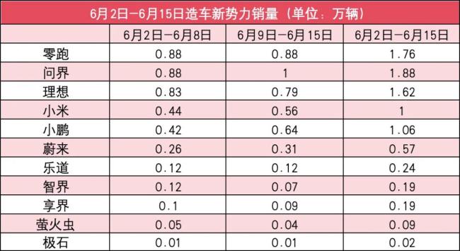 新势力6月第2周销量榜:问界重夺第一,小鹏超小米,仅1家过万