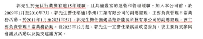 据公司招股说明书披露,郭鹏在光伏行业已经超过15年经验,应该是从无锡晶翔新能源科技有限公司算起。