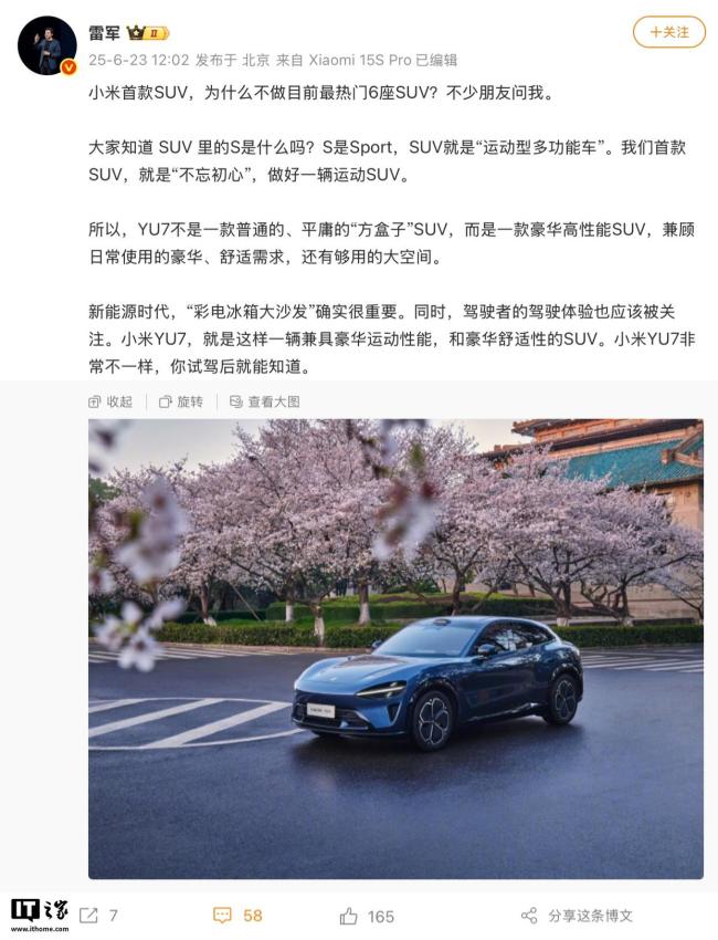 雷军强调,YU7并非一款普通的SUV,而是一款豪华高性能车型,旨在满足用户对豪华与舒适的日常需求,同时保证足够的内部空间。在新能源汽车时代,虽然车内配置如彩电、冰箱、大沙发变得越来越重要,但驾驶体验同样不可忽视。YU7不仅具备豪华运动性能,还兼顾了豪华舒适性,试驾后可以感受到其独特之处。