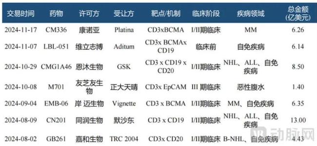 CD3/BCMA靶点诞生了2024年下半年出海最多的TCE双抗,康诺亚、岸迈都实现了总额6亿美元以上的交易。