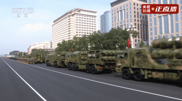 反舰导弹方队驶过天安门广场。鹰击-15导弹和鹰击-19、鹰击-17、鹰击-20高超声速导弹,是打击海上之敌的“尖兵利器”。