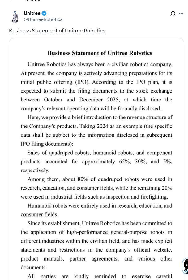 宇树在声明中还透露了公司产品的营收结构。以2024年为例,四足机器人、人形机器人和零部件产品的销售额分别约占65%、30%和5%。其中,约80%的四足机器人用于科研和教育领域,其余20%则用于工业领域的检查和消防等。人形机器人则全部用于科研、教育和消费领域。宇树表示,公司一直致力于在民用领域应用高性能通用机器人,并在公司官网、产品手册、合作伙伴协议及其他各类文件中明确声明了其应用限制。