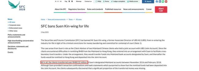 该案件最初要追溯到2016年,据证监会公告披露,两名中国内地客户因跨境汇款至香港遇到困难,委托当时的瑞银客户顾问孙健荣协助处理资金转移。孙健荣提出,要求客户将款项汇至其指定的内地银行账户,声称会代为转存至客户在瑞银的联名账户。