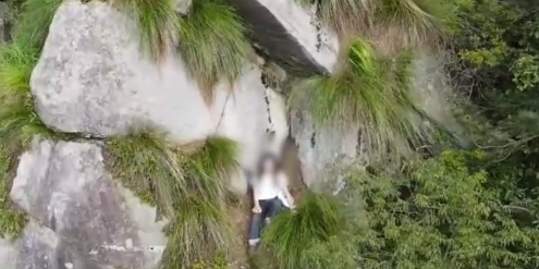6月13日14时19分,江西九江庐山风景区内,一名游客为捡掉落悬崖的手机翻越栏杆,不慎滑落至近乎垂直的崖壁陡坡,被困于灌木丛中,身体多处擦伤,随时有坠落风险。