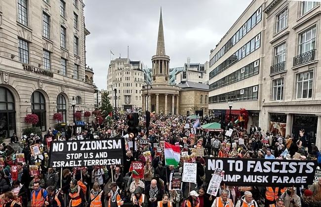 此次抗议由“抵制特朗普联盟”牵头,联合50个民间组织共同发起,初衷为反对特朗普再度获得英国高规格接待。现场大量示威者手持巴勒斯坦国旗,高呼“自由,自由,巴勒斯坦”、“1234,占领必须结束;5678,以色列是恐怖国家”等口号,相关标语亦随处可见。