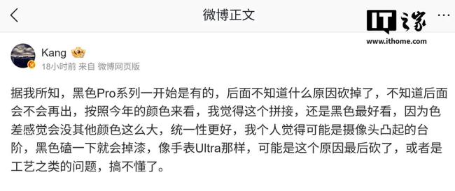 博主 @Kang 在微博上透露,苹果 iPhone 17 Pro 系列手机原本计划推出黑色版本,但后来被取消了。具体原因尚不清楚,也不确定未来机型是否会重新引入黑色。