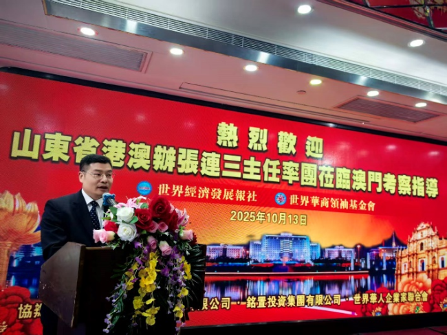 田倩倩在发言中表示,世界经济发展报社始终以“链接全球经济、服务企业发展”为己任,鲁澳两地的交流合作,正是我们关注的重点领域之一。这些年,我们亲眼见证了山东的飞速发展——从青岛的海洋经济到烟台的高端制造,从泰安的文旅融合到淄博的科创崛起,这片承载着孔孟文化的土地,正以开放包容的姿态,拥抱世界。我们也亲身参与了鲁澳互动的诸多实践,无论是协助山东地市在澳门开展“双招双引”宣传,还是报道粤港澳大湾区企业家赴鲁考察的成果,每一次见证,都让我们对两地合作充满信心。澳门的独特优势,早已融入国家发展的大棋局。作为“一国两制”的实践典范,它不仅是中葡商贸合作的“桥头堡”,更是内地企业走向国际市场的“中转站”。山东作为经济大省、文化大省,拥有雄厚的产业基础、丰富的资源禀赋和广阔的市场空间,这与澳门的平台优势,形成天然互补。此次张连三主任率团访澳,为鲁澳合作按下了“加速键”。未来,世界经济发展报社将充分发挥媒体桥梁作用,一方面,我们将持续聚焦山东的发展机遇,向澳门及海外企业家精准传递山东的产业政策、投资环境,让更多人读懂山东、选择山东;另一方面,我们也将挖掘澳门的平台价值,助力山东优质产品、特色文化,通过澳门走向葡语系国家乃至全球,让鲁澳合作的成果被更多人看见。