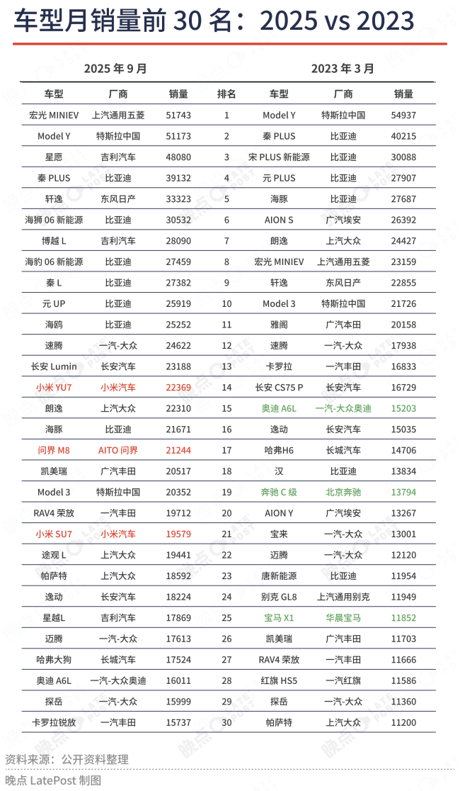 这些冷冰冰的数字背后,讲述的是一个新品类逐渐从弱小成为主力的过程,也就是新能源和传统能源在市场当中此消彼长的过程。拉出2023年3月和2025年9月单车月销量排名前三十数据,2023年3月有11款新能源产品,但全部来自于四家车企——特斯拉、比亚迪、广汽埃安和上汽通用五菱。而2025年9月,有15款上榜新能源产品,同时它们分别来自八个企业。新能源的占比提升,同时集中度分散,证明市场已经打开。