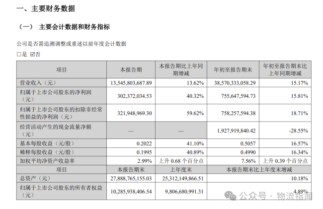 10月28日消息,申通快递公布三季度业绩。财报显示,2025年第三季度实现营业收入135.46亿元,同比增长13.62%;归属于上市公司股东的净利润3.02亿元,同比增长40.32%;基本每股收益0.2022元。前三季度实现营业收入385.7亿元,同比增长15.17%;归属于上市公司股东的净利润7.56亿元,同比增长15.81%。