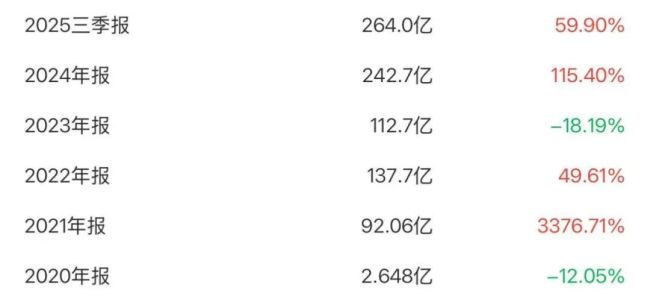 数据显示,2021年至2025年前三季度,公司分别实现营收92.06亿元、137.70亿元、112.70亿元、242.70亿元、264.00亿元,分别增长3376.71%、49.61%、-18.19%、115.40%、59.90%,整体规模从原来的不到3亿元,跃升至超过260亿元,可谓惊人。