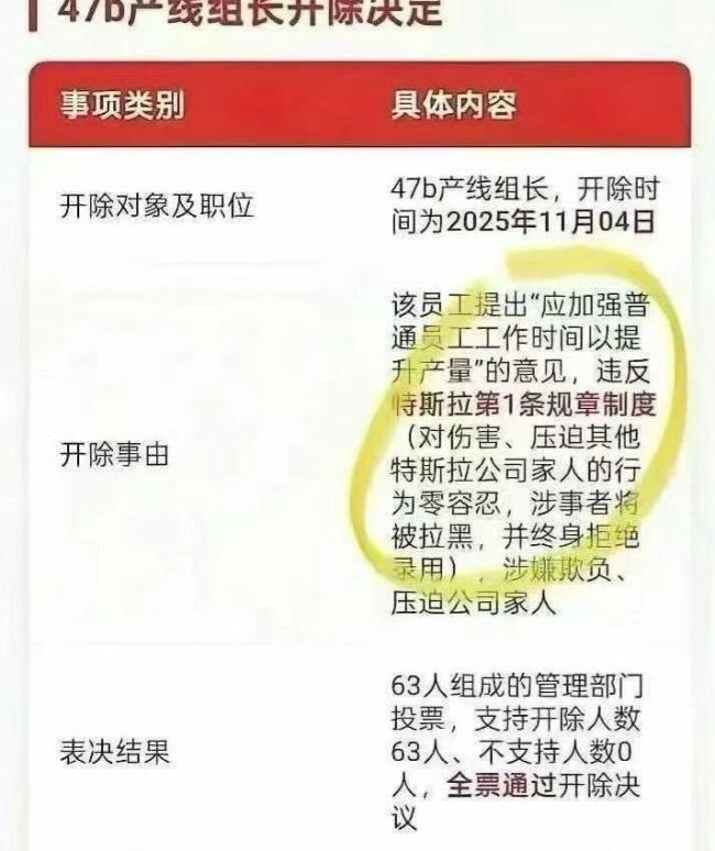 近日,一张特斯拉中国公司开除员工的决定书流出,理由是对一名提出“加强普通员工工作时间以提升产能”建议的产线组长作出开除处理,该决定由63人组成的管理部门全票通过。据了解,事件发生在2025年11月4日,当时正值特斯拉上海超级工厂订单高峰期。这名47号产线组长提出延长工时的建议,但被公司认定违反“对伤害、压迫其他特斯拉公司家人的行为零容忍”的第一条规章制度。