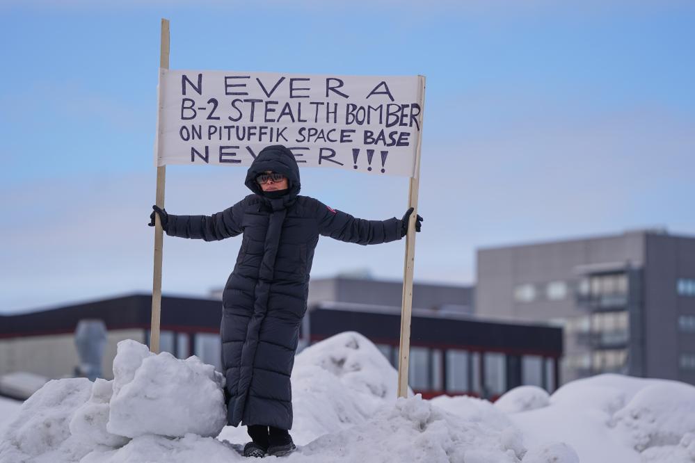 2025年3月28日,在丹麦自治领地格陵兰岛首府努克,一名女子举着抗议标语。新华社记者彭子洋摄
