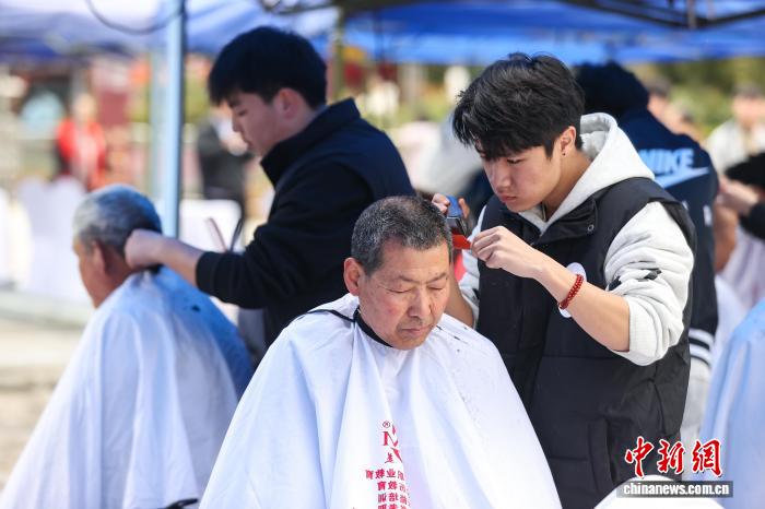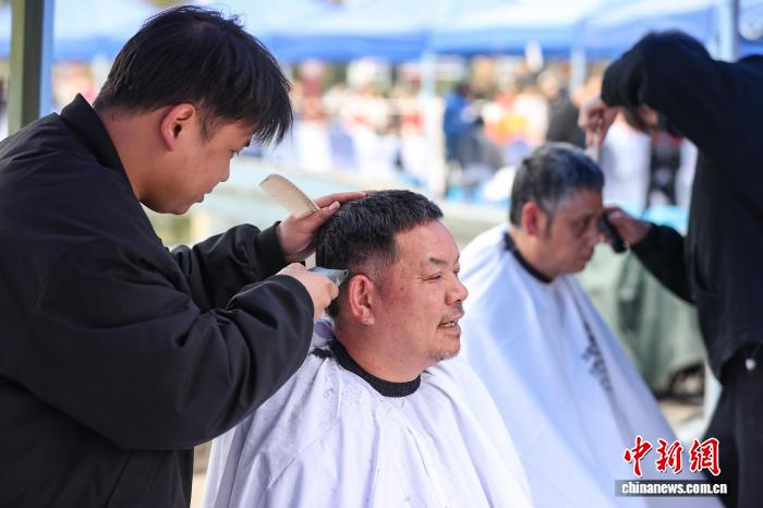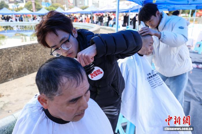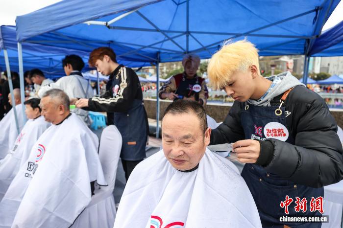3月20日,农历二月初二,民间有“二月二,剃龙头”的传统习俗,贵州省遵义市红花岗区在遵义纪念广场举行“百人义剪”公益活动,为环卫工人、老人等免费理发。记者 瞿宏伦 摄