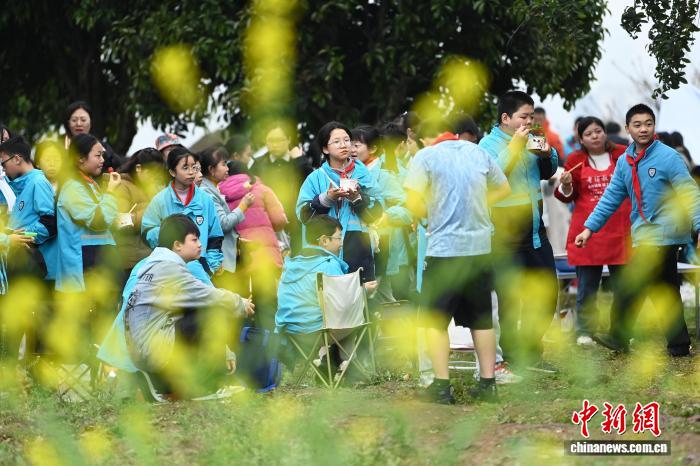 3月20日,重庆两江新区回兴小学开展校园户外野炊活动。在家长配合下,学生们来到校园空地体验户外烫火锅、烧烤,伴着春日烟火气亲近自然、放松身心,感受别样的趣味校园生活。图为学生在户外野炊。中新社记者 陈超 摄