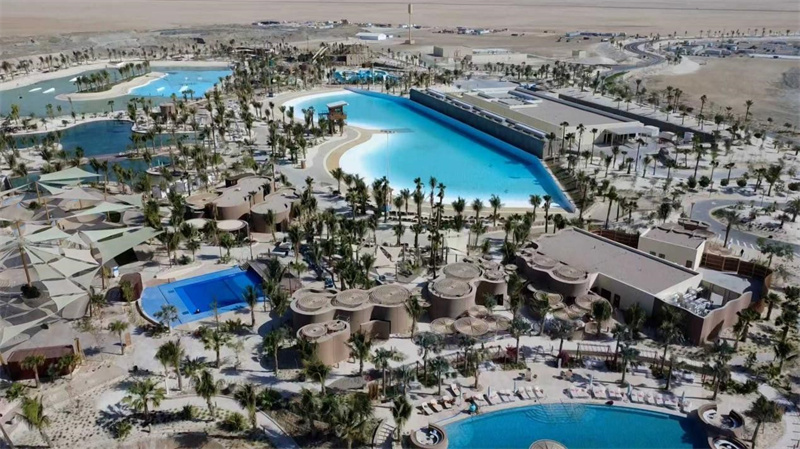 据介绍,该项目位于沙特西海岸红海高端旅游开发区域,总建筑面积5万余平方米,包含冲浪湖区、深海体验区、滑水板区、沙滩俱乐部、尾波公园等10大核心景点,主要施工内容涵盖水池结构、房建结构、挡土墙系统等。其中冲浪湖采用循环自然海水,造浪锋线长215m,可调节浪高最大可达2.1m,是目前沙特阿拉伯最大的冲浪池。