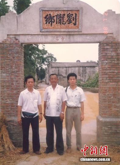 1988年,刘卓辉与父亲陪叔公(中)回到广东潮州老家。受访者供图