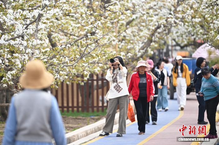 4月12日,位于甘肃省兰州市皋兰县什川古镇的万亩百年古梨园花开吸引游人踏青拍照。中新社记者 李亚龙 摄