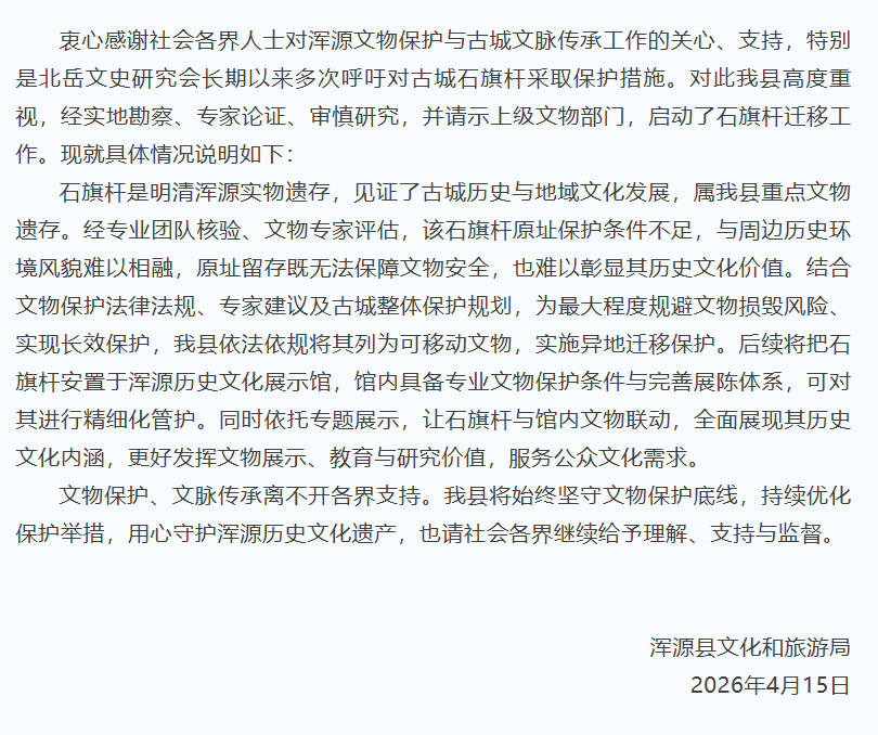 中新网4月15日电 据浑源县文化和旅游局微信公众号消息,山西大同市浑源县文化和旅游局15日发布关于浑源古城石旗杆保护迁移工作的情况说明称,经专业团队核验、文物专家评估,该石旗杆原址保护条件不足,与周边历史环境风貌难以相融,原址留存既无法保障文物安全,也难以彰显其历史文化价值。结合文物保护法律法规、专家建议及古城整体保护规划,为最大程度规避文物损毁风险、实现长效保护,浑源县依法依规将其列为可移动文物,实施异地迁移保护。