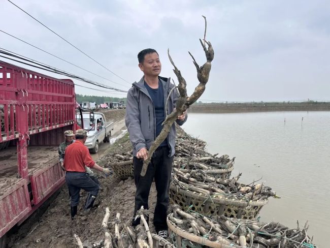 一年等待,张海晖迎来收获:首批25万斤“香粉王”种苗繁育成功,移栽一千亩藕塘,预计可年产280万斤莲藕。