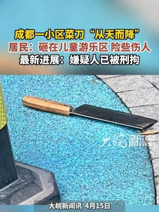 4月15日,成都中南樾府小区发生一起高空抛物事件,一把菜刀从天而降,险些砸到人。这把菜刀落在儿童游乐区,引起了居民的恐慌。有人立即报警,警方迅速到场调查,并在现场拉起了警戒线。