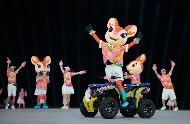 4月22日,以“天海之约”为主题的第六届亚洲沙滩运动会开幕式在海南三亚亚沙公园举行。夜幕下的三亚亚沙公园灯火辉煌,流光溢彩。当晚8时,开幕式正式开始。伴随着动感旋律,赛事吉祥物“亚亚”骑着沙滩摩托车引领亚奥理事会45个成员代表团依次入场。