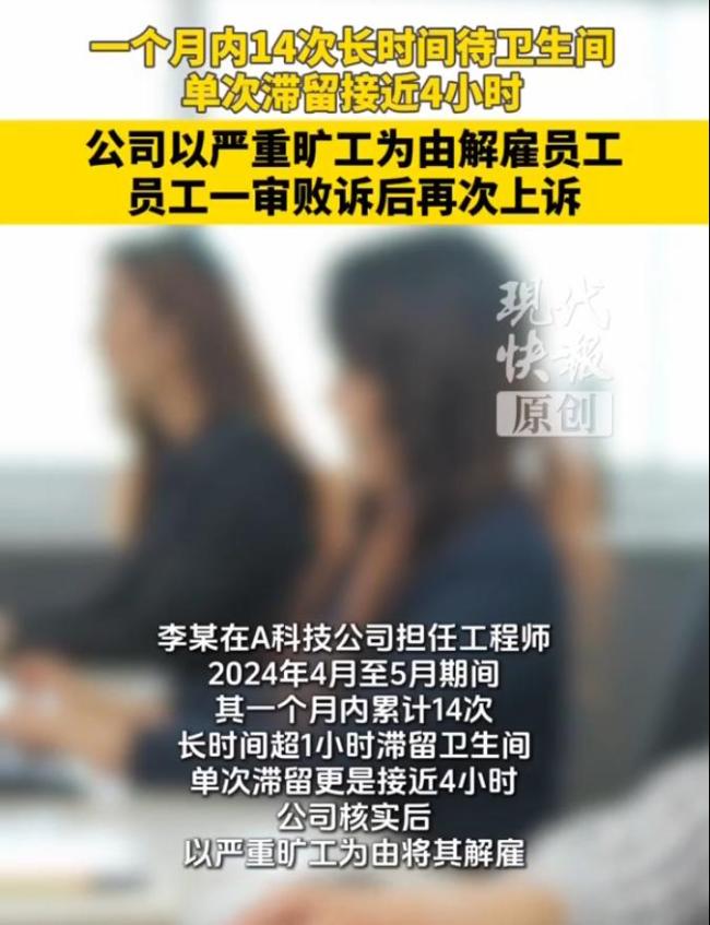 员工李某因长时间“带薪如厕”被解雇,这一事件引起了广泛关注。苏州工业园区人民法院最近审理了此案。李某在一个月内14次长时间超过1小时滞留在卫生间,单次甚至接近4小时