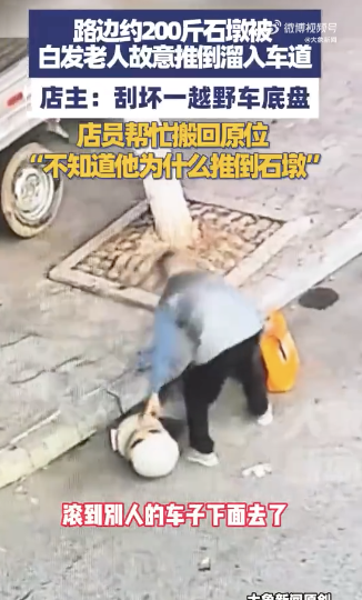 白发老人故意推倒路边200斤石墩。9月22日,湖南邵东,路边约200斤石墩被白发老人推倒,溜入车道,店主称:“刮坏一辆越野车底盘,店员帮忙搬回原位,不知道他为什么要推倒石墩。白发老人故意推倒路边200斤石墩溜入车道...