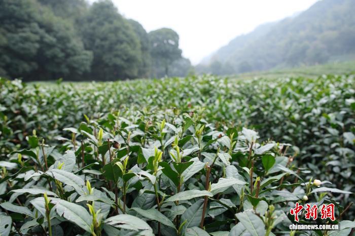 3月19日,杭州西湖龙井43号长势喜人。当日,西湖龙井茶开茶典礼在浙江杭州西湖龙井核心产区梅家坞举行,宣告春茶正式开采。中新社记者 曹丹 摄