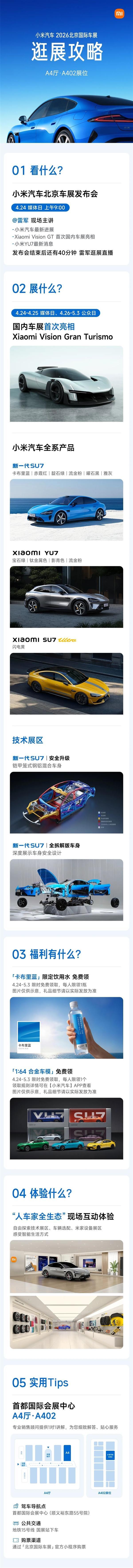 2026北京车展即将开幕,小米汽车在展台准备了多项活动。4月24日上午9点,雷军将在小米展台主持发布会,介绍小米汽车的最新进展,并首次在国内展示Xiaomi Vision GT。此外,还将发布YU7的最新消息