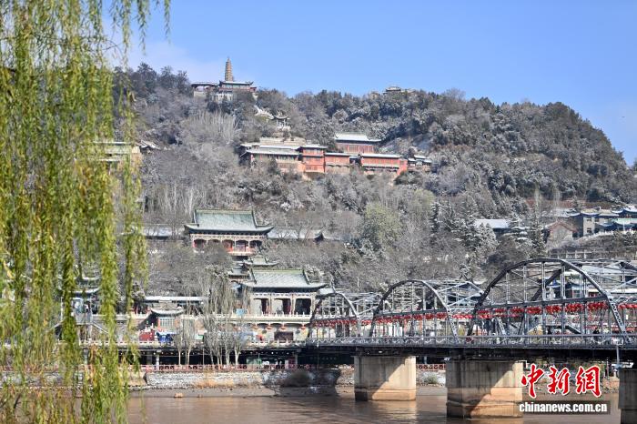 11月24日,甘肃兰州迎来今冬首场降雪。图为雪后的兰州中山桥和白塔山公园。中新社记者 九美旦增 摄