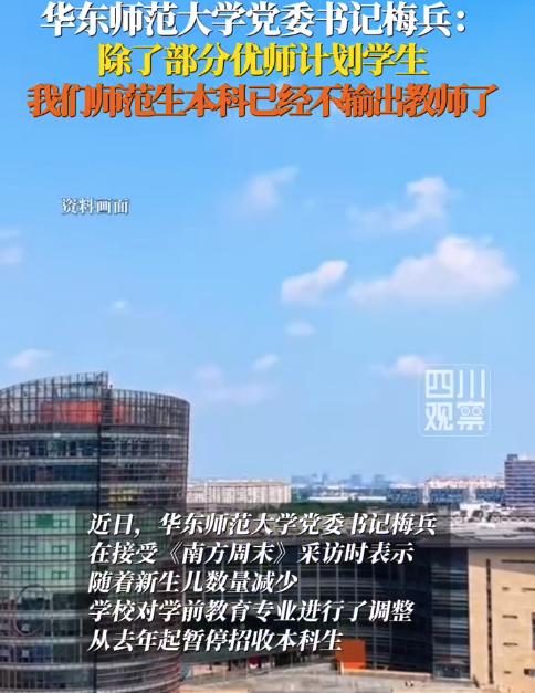 近日,华东师范大学党委书记梅兵在接受《南方周末》采访时表示,随着新生儿数量减少,学校对学前教育专业进行了调整,从去年起暂停招收本科生。这是因为国内不少高校能够满足承担本科层次的学前教育师资培养任务,我们则将资源更多集中到更高层次的人才培养,...
