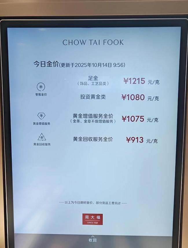 贵金属价格持续上涨,周大福、潮宏基等品牌金饰克价已涨至1215元/克。根据WIND数据,伦敦现货黄金继10月13日大涨2.29%后,10月14日继续刷新历史纪录,达到4150美元/盎司,盘中最高触及4179美元/盎司