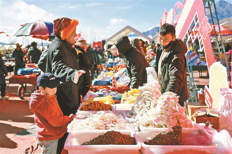 市民群众在年货节上选购年货。 演员在开幕式上表演节目。 年货节上,市民满载而归。