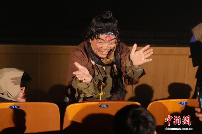 2月12日,非遗奇幻音乐戏剧《夏小正·奇幻年》在长沙首演。剧目源自古老农事历书《夏小正》,将皮影、剪纸、年画等非遗与光影相融,为少年儿童讲述充满年味的中国新春故事。图为演员与孩子们互动。中新社记者 杨华峰