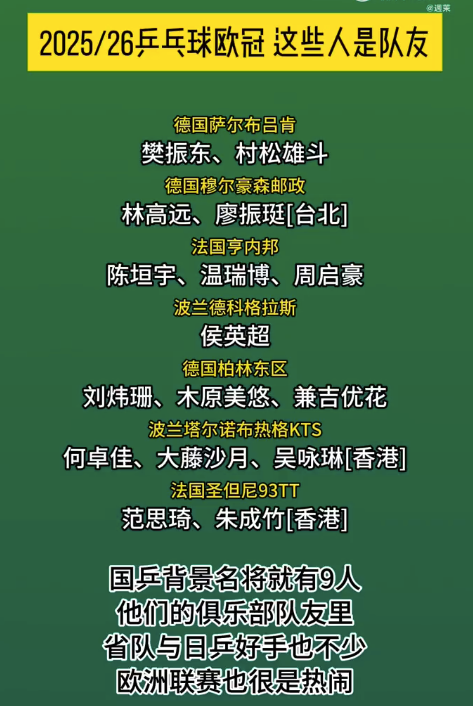 2025-2026赛季乒乓球欧冠联赛阵容公布,多位国乒背景球员赫然在列!“金满贯”樊振东加盟德国萨尔布吕肯,将携手队友冲击欧冠四连冠,他的欧洲首秀备受期待。林高远也将代表德国穆尔豪森邮政参赛,开启新征程。此外,陈垣宇、温瑞博、周启豪齐聚法国...